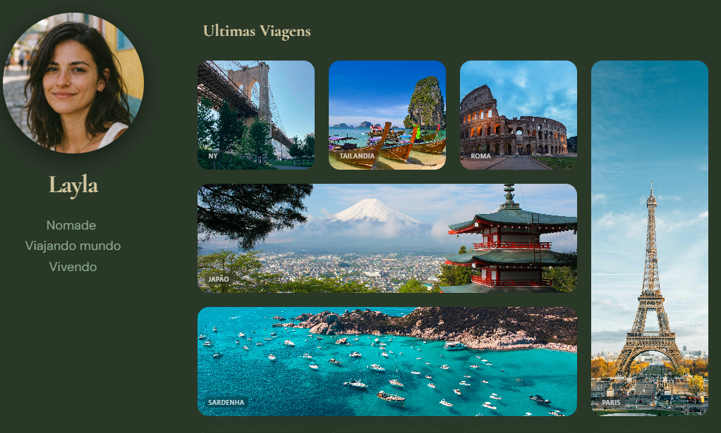 Viagens, lugares favoritos e memórias — tudo reunido em uma página só.